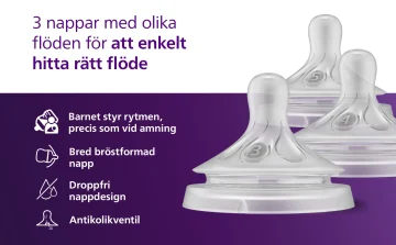 Philips Avent Dinappar Natural Response Mix & Match är ett mixpack med dinappar i tre olika storlekar. Innehåller dinappar som ger medium, snabbt och ultrasnabbt flöde (storlek 3, 4 och 5) så att du lätt kan hitta det flöde som passar just ditt barn bäst och kan välja nästa storlek i takt med att barnet växer. Natural Response-napparna är speciellt utformade för att efterlikna ett bröst och släpper endast ut mjölk när barnet suger aktivt, på så vis blir det en amningslik flaskmatning och minskar risken för spill. Ventilen är utformad på ett sätt som håller luften från bebisens mage borta, något som minskar risken för kolik. 3 st.