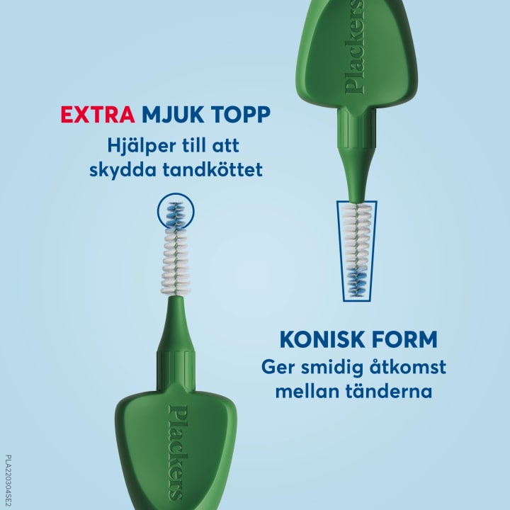 Plackers Gentle Brush är mellanrumsborstar med extra mjuk tipp. Borsten har en konisk form och extra mjuk tipp som gör rengöringen mer skonsam mot tandköttet. Mellanrumsborsten har ett ergonomiskt handtag för optimalt grepp. 6st.