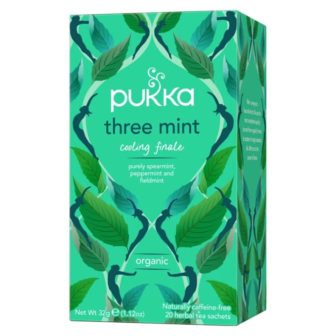 Pukka Örtte Three Mint är en grönskande örtblandning av tre sorters mynta som ger en uppfriskande kopp te. Svalkande smaker med fräsch smak från grön mynta, åkermynta och pepparmynta som är naturligt fri från koffein. Framställd av bara naturligt och ekologist odlade ingredienser som är etiskt rättvisemärkta. 20-pack tepåsar.