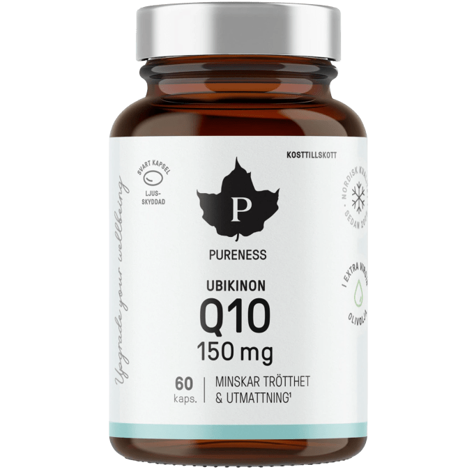 Pureness Q10 Ubikinon 150 mg är ett kosttillskott med ubikinon Q10 i extra virgin olivolja. Innehåller 150 mg fermenterat ubikinon och 15 mg vitamin C. Vitamin C bidrar till normal energiomsättning samt till att minska trötthet och utmattning. Mjuk gelatinkapsel som färgats svart med hjälp av vegetabiliskt kol för att göra kapseln ljusskyddad för Q10 som är mycket känsligt för ljus. 60 kapslar.