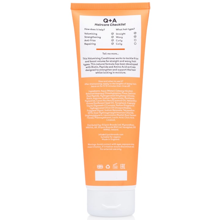 Q+A Volumising Conditioner är ett volymgivande balsam berikat med biotin, peptider och aminosyror som ger håret fyllighet, fukt och glans. Innehåller även hyaluronsyra som återfuktar intensivt och kapslar in fukt i hårstråna. Håret får en frisk och mjuk textur med mycket glans och minskad frissighet. Innehåller 96,7% naturliga ingredienser och passar alla hårtyper. Vegansk, silikonfri och sulfatfri formula. 250 ml.