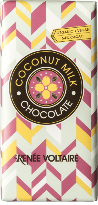 Renée Voltaire Chokladkaka Kokosmjölk är vegansk och glutenfri. Chokladen innehåller kokosmjölk och kokossocker. Kakaohalten ligger på 54%. Ingredienserna är ekologiska och förutom vanilj innehåller den endast kakao och kokos. 80 g.