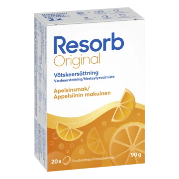 Resorb brustablett Apelsin är en vätskeersättning med smak av apelsin som hjälper till att återställa vätske- och saltbalansen i kroppen. Med kolhydrat-elektrolytlösningar förbättrar vattenupptaget vid fysisk träning. Använd ej vid nedsatt njurfunktion och/eller minskad urinmängd. Resorb brustablett Apelsin rekommenderas för vuxna och barn från 3 år. 20 brustabletter per förpackning.