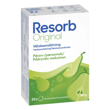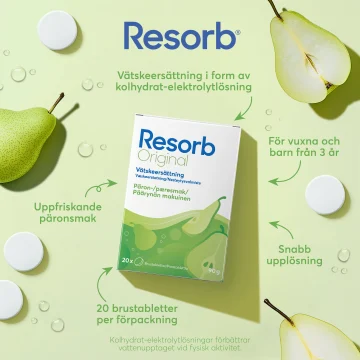 Resorb Original Päron är en vätskeersättning i form av brustabletter med smak av päron som hjälper till att återställa vätske- och saltbalansen i kroppen. Med kolhydrat-elektrolytlösningar förbättrar vattenupptaget vid fysisk träning. Använd ej vid nedsatt njurfunktion och/eller minskad urinmängd. Brustabletterna är förpackade i två rör, vilket gör att de är smidiga att ta med sig. För vuxna och barn från 3 år. 2x10 st. 90 g.