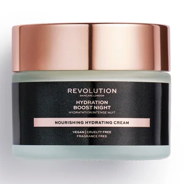 Revolution Skincare Hyaluronic Acid Hydrating Night Cream är en nattkräm med fuktbindande hyaluronsyra. Lätt formula som absorberas snabbt av huden och låter dig vakna med en smidig, återfuktad hud. Berikad med mjukgörande illipenötsmör och fuktbevarande persikokärnolja samt glykogen som kan bidra till att öka effektiviteten hos hyaluronsyran. Passar normal hy. Vegan. 50 ml.