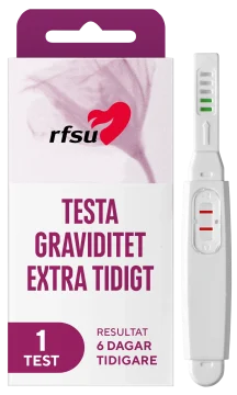 RFSU Early Tidigt Graviditetstest ger dig möjlighet att testa om du är gravid så tidigt som möjligt. Du kan göra testet redan 6 dagar innan utebliven menstruation. Det är enkelt att använda eftersom att du kan kissa direkt på testet. Du får ett tydligt resultat med ett eller två streck inom 1-5 minuter. Om testet visar ett svagt positivt resultat rekommenderas att testa igen 2 dagar senare. Testet är över 99% tillförlitligt från och med dagen du väntar din mens. Du kan testa när som helst under dygnet men säkrast är att mäta morgonurinen, då hCG-koncentrationen är som högst.