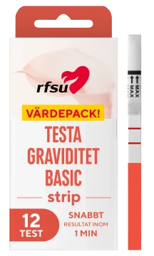 RFSU Graviditetstest Strips är enkla att använda hemma för att ta reda på om du är gravid och ger ett svar inom 1 minut vid test samma dag om du väntar din mens. Innehåller teststickor som doppas i behållare med urin och visar ett tydligt resultat med ett eller två streck. Testets känslighet är 25 mlU/ml av hormonet hCG i urinen. Du kan testa när som helst under dygnet men säkrast är att mäta morgonurinen, då hCG-koncentrationen är som högst. Testet är över 99% tillförlitligt från och med dagen du väntar din mens.