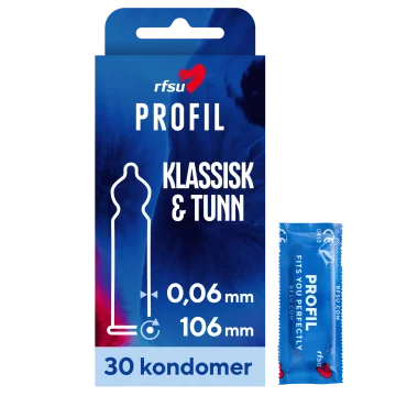 RFSU Profil Kondom är en tunn kondom som anpassar sig efter kroppens form. Kondomen är tunn, slät och har en insvängd topp för optimal passform och ökad känsla. Kondomen har en behålla i toppen, är ofärgad och slät med extra glidmedel i silikon. 30st.