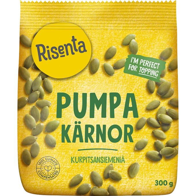 Risenta Pumpakärnor är av hög kvalitet. Pumpakärnor har en mjuk nötsmak som framhävs ytterligare när de rostas. Pumpafrön är goda att äta som dem är eller att toppa maten med samt använda i bakning eller ha i smoothie. 300 g.