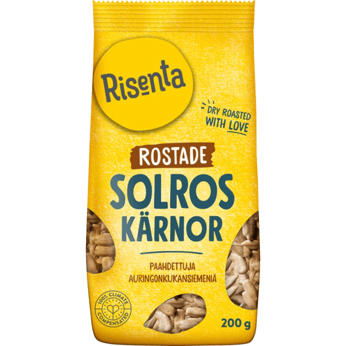 Risenta Solroskärnor Rostade är skalade solrosfrön från solrosen. Goda som snacks eller för att toppa sallad och soppa med. 100% klimatkompenserad. 200 g.