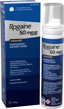 Rogaine® Kutant skum 50 mg/g är ett receptfritt läkemedel som innehåller minoxidil och används för behandling av ärftligt håravfall hos män. Rogaine ska endast användas i hårbotten. 60 g.