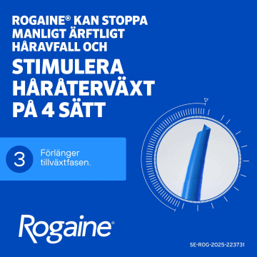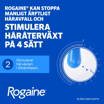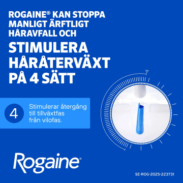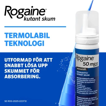 Användarinstruktioner: Appliceras på området med håravfall i hårbotten. Håret och hårbotten ska vara helt torra innan Rogaine® Skum appliceras. Applicera en dos på 1 g skum (motsvarar volymen av ett halvt lock) på fingertopparna och massera på området med håravfall i hårbotten två gånger dagligen. Sätt på locket på behållaren när den inte används. Använd inte mer än 2 g skum per dag och applicera inte oftare än två gånger dagligen (tätare applikationer påskyndar inte effekten och risken för biverkningar kan öka). Tvätta händerna efter användning. Om du inte har märkt någon håråterväxt efter 4 månader, ska du sluta använda Rogaine® Skum. Kontinuerlig användning är nödvändig för att öka och bibehålla håråterväxt, annars börjar håravfallet igen. Denna produkt ska inte användas av kvinnor. Endast för utvärtes bruk. Används inte vid plötsligt eller fläckvis uppträdande håravfall, om hårbotten är inflammerad, infekterad, irriterad eller smärtar. Fråga din läkare om råd innan du använder denna produkt om du har en hjärtsjukdom med onormal hjärtrytm eller hjärtfrekvens, kärlkramp eller bröstsmärta och/eller cirkulationsrubbningar. Läs hela bipacksedeln noga före användning, där hittar du t.ex. viktig information om hur och när läkemedlet kan användas. Du hittar bipacksedeln på Fass.se.