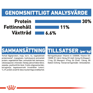 SAMMANSÄTTNING: dehydrerade fjäderfäproteiner, majs, vegetabiliska fibrer, korn, ris, vetegluten*, majsgluten, hydrolyserade animaliska proteiner, djurfetter, betmassa, majsmjöl, pulvercellulosa, fiskolja, psylliumskal och -frö, jästprodukter, mineraler, sojaolja, fruktooligosackarider, natriumbutyrat, gurkörtsolja, glukosamin från fermentering, mjöl av ringblomma, hydrolysat av brosk (källa till kondroitin). ANALYSERAT INNEHÅLL: Protein: 30,0 % - Växttråd: 8,6 % - Fettinnehåll: 11,0 % - Råaska: 5,0 %. TILLSATSER (per kg): Näringstillsatser: Vitamin A: 22000IE, Vitamin D3: 1000IE, Järn (3b103): 35mg, Jod (3b201, 3b202): 3,5mg, Koppar (3b405, 3b406): 11mg, Mangan (3b502, 3b504): 45mg, Zink (3b603, 3b605, 3b606): 134mg, Selen (3b801, 3b811, 3b812): 0,04mg, L-karnitin: 200mg - Konserveringsmedel - Antioxidanter. *L.I.P.: protein utvalt för dess mycket höga smältbarhet. UTFODRINGSANVISNING: se tabell. Partinummer, fabrikens registreringsnummer och bäst före datum: se förpackning. Förvaras svalt och torrt.
