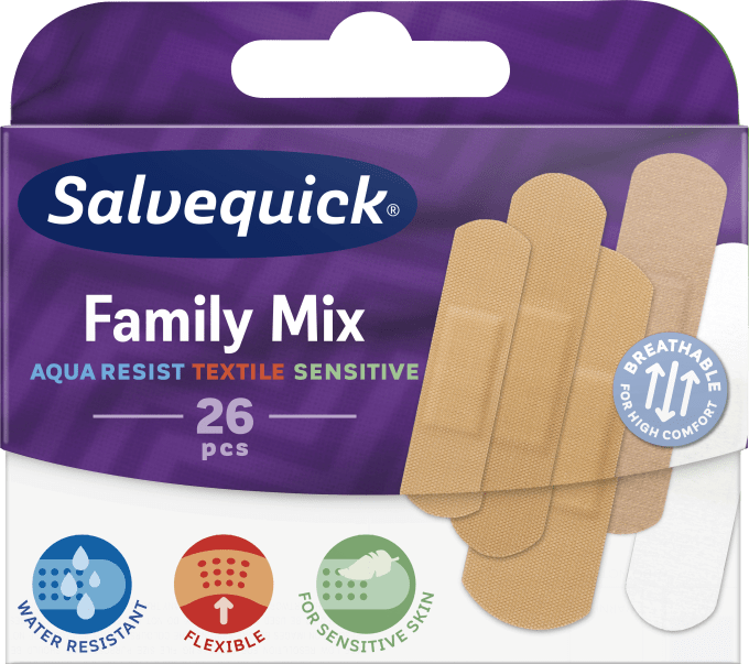 Salvequick Family Mix är ett familjepack med en mix av olika plåster. Stort urval av olika material och storlekar. Innehåller vatten- och smutsavvisande plastplåster, hudvänliga och elastiska textilplåster som passar för de flesta små olyckor. 26 st.