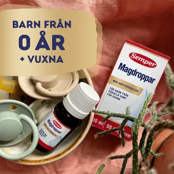 Semper magdroppar är en oljelösning med bakteriekultur. Dropparna innehåller den naturliga mjölksyrabakterien Lactobacillus reuteri Protectis. Dagsdosen på 5 droppar/dag ger 100 miljoner levande laktobaciller. Tas tillsammans med mat och dryck eller direkt på sked. Kan användas både till spädbarn, småbarn och vuxna. 10 ml.