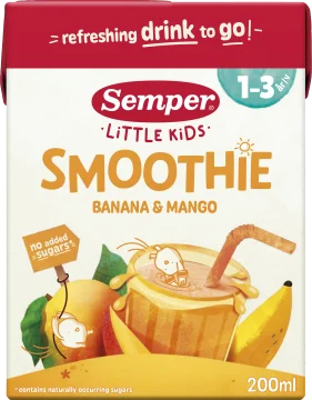 Semper Smoothie Banan Mango är en smakrik och fruktig dryck anpassad för barn över 1 år. Det medföljande sugröret gör smoothien till ett bra mellanmål att packa med på resan. Helt utan tillsatt socker. Från 1 år. 200 ml.