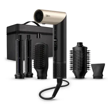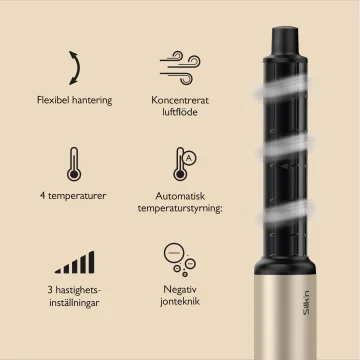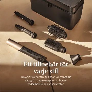 Silk'n Silky Air Flex-5 är ett hårstylingsverktyg med flera funktioner. Den har en borstlös motor samt flexfunktion som förvandlar det från en kraftfull hårfön till ett allt-i-ett-verktyg för hårstyling. Håret kan stylas med fyra olika temperaturer, det torkar håret snabbt med det koncentrerade luftflödet och har även fem olika tillbehör som kan skapa olika typer av frisyrer. Den ovala formen gör att du lättare kan nå rötterna på ett effektivt sätt, vilket ger extra volym. Autowrap-tillbehöret ger definierade lockar. Paddelborsten är idealisk för att torka och reda ut hår med. Specifikationer: - 5 olika tillbehör: 2x autowrap, volymborste, paddelborste och koncentrator - Hårstyling med kraftfullt koncentrerat luftflöde (57 km/h) - 4 temperaturnivåer (39°C, 50°C, 70°C, 90°C) och 3 hastighetsinställningar - Inklusive förvaringsväska