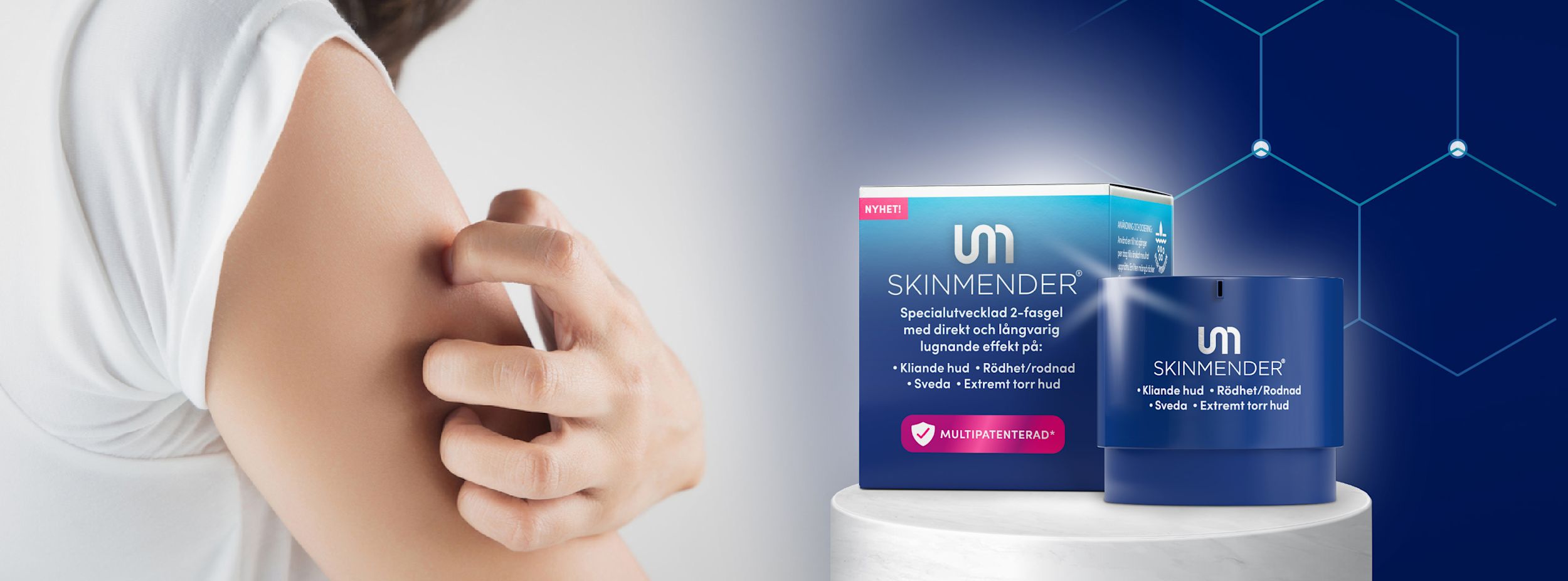 Skinmender® är en patenterad 2-fasgel som är utvecklad för att ge både omedelbar och långvarig lindring. Gelen verkar effektivt på hudbesvär som rodnad, sveda och torrhet. Den unika tvåfasteknologin gör det möjligt att kombinera höga halter av både vatten- och oljelösliga ämnen i en och samma produkt.