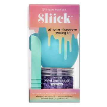 Sliick by Salon Perfect At Home Microwave Waxing Kit är ett kit för hårborttagning med vax. Kitet består av en återuppvärmningsbar behållare i silikon, fylld med acaibärsdoftande vaxpärlor som värms upp och appliceras med en medföljande applikator. Vaxet passar bäst för hårborttagning av små områden eftersom att vax svalnar efter att ha värmts upp. Om du önskar vaxa större områden kan vaxet behöva värmas upp på nytt. Är mest effektivt på grova hårstrån, flera applikationer av vaxet kan behövas för att få bort fina och tunna oönskade hårstrån. 113 gram.