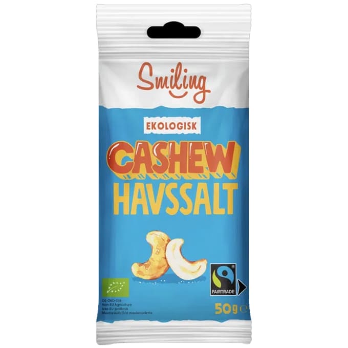 Smiling Cashewnötter Havssalt är ekologiska och Fairtrade-märkta cashewnötter från Smiling som är saltade med havssalt. På Smiling undviker vi onödiga tillsatser och långa innehållsförteckningar. Istället använder vi hellre naturliga och ekologiska råvaror. 55 g.