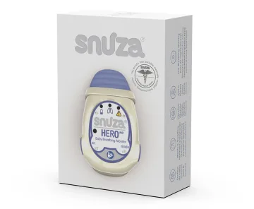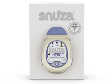 Snuza HeroMD är ett mobilt andningslarm för spädbarn. Andningslarmet är certifierat medicintekniskt och bevakar ditt barns andning medan det sover. Larmet drivs av ett batteri så inga sladdar stör. Du fäster det på blöjan eller byxan och det kan användas på natten i sängen eller på dagen när babyn sover. Andningslarmet fungerar i två steg; efter 15 sekunder utan någon andningsrörelse vibrerar det för att aktivera bebisen så att den börjar andas; efter ytterligare 5 sekunder (totalt 20 sekunder) om barnet inte börjat andas eller om larmet känt av färre än åtta andningsrörelser per minut startar ett ljudlarm. Om andningen istället kommit igång direkt efter vibrationsläget går Snuza Hero tillbaka till övervakningsläget. Om det däremot startat vibrationsläget tre gånger avger det en varningssignal som uppmärksammar återkommande andningsuppehåll. Kan även användas på tvillingar som samsover och prematurfödda barn. Snuza Hero MD sänder eller överför inte ljud eller någon typ av radiofrekvens vilket innebär att det inte finns risk för någon radiofrekvent strålning. Man kan använda Snuza HeroMD tillsammans med en elektronisk babyvakt om föräldern t.ex. är i ett annat rum. Andningslarmet är litet och smidigt: 65x45 mm, vikt 31 g. Drivs av utbytbart batteri (batteritid ca 6 mån), ingen sladd eller eluttag behövs. Läs och följ noga leverantörens instruktioner som följer med produkten.