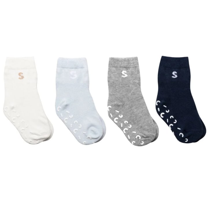 STUCKIES Strumpor i bomull (Anti-Slip) Wavy är babystrumpor framtagna för att hålla sig kvar på fötterna oavsett om barnet kryper, försöker dra eller sparka av strumporna. Strumporna är designade med resår runt hålfoten och runt mitten av skaftet vilket minskar risken för att strumpan glider av. Strumporna har även prickar av 100% medicinsk silikon på insidan av skaftet och “sömlös tå” med plan söm för att inte irritera små och känsliga tår. 4-pack. Storleksrekommendation: Följ barnets skostorlek istället för ålder. Små i storlek, välj hellre en större storlek. Storlekar: 10/15 ≈ 0-6 mån (utan anti-slip) 16/18 ≈ 6-12 mån 19/21 ≈ 1-2 år 22/24 ≈ 2-3 år 25/27 ≈ 3-4 år