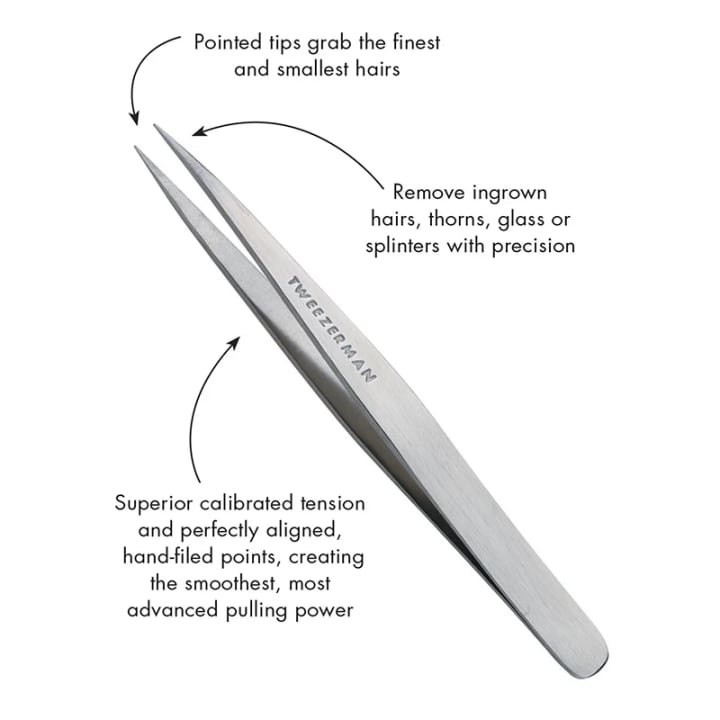 Tweezerman Point Tweezer Classic är en fint avsmalnande spetspincett som fångar även de minsta och finaste hårstråna. Perfekt att plocka ögonbrynen med och låter dig även ta bort inåtväxande hårstrån och flisor.