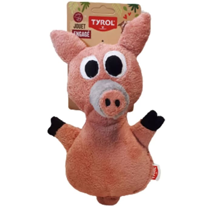 Tyrol Hundleksak Cochon är tålig och mjuk leksak till hund. Rolig figur i form av en gris gjord i återvunnet material med pipljud. 27 cm.