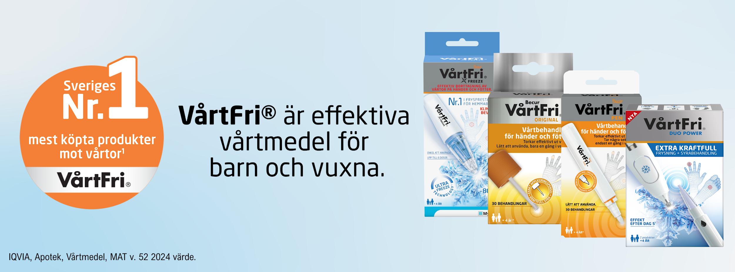 VårtFri är en serie medicintekniska produkter för behandling av vårtor på händer, fötter, armbågar och knän. Produkterna är lämpliga för vuxna och för barn från 4 år, där behandlingen alltid ska utföras av en vuxen. VårtFri erbjuder två olika metoder för vårtborttagning vilket gör det enkelt att hitta rätt behandling för hela familjen.