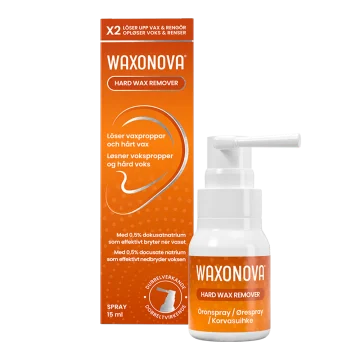 Waxonova Hard Wax Remover Öronspray hjälper till att lösa upp vaxproppar och hårt öronvax. Öronsprayen innehåller 0,5% dokusatnatrium, ett ytaktivt ämne som effektivt bryter ner och löser upp hårt vax och vaxproppar samtidigt som hörselgången rengörs. Sprayen innehåller även propylenglykol och glycerin som hjälper till att smörja och skydda hörselgången, vilket förebygger att nytt vax ansamlas. Waxonova Hard Wax Remover passar för vuxna och barn från 2 år. 15 ml.