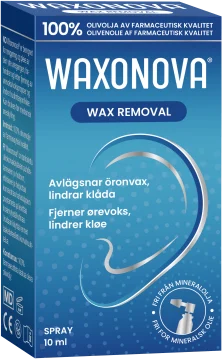 För att ta bort öronvax och vid klåda/irritation i torra hörselgångar spraya Waxonova 1–2 gånger i veckan eller enligt ordination av vårdpersonal. Waxonova kan med fördel användas några dagar inför medicinsk öronspolning för att underlätta avlägsnandet av vaxproppar. För att mjuka upp vaxproppar och avlägsna öronvax inför medicinsk öronspolning spraya Waxonova 1–2 sprayningar 2 gånger dagligen eller enligt ordination av vårdpersonal. Waxonova ska inte användas vid perforerad trumhinna eller vid överkänslighet mot olivolja. Öronsprayen ska inte användas samtidigt som andra preparat som appliceras i örat (t.ex. örondroppar). För vuxna och barn. Hållbarhet 6 månader från öppnandet. Innan användning av Waxonova Wax Removal kan Waxonova Daily Ear Cleanser med fördel användas för att skölja och rengöra hörselgången.