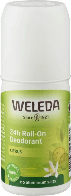 Weleda 24h Roll-On Deodorant Citrus är en aluminiumfri, ekologisk unisex-deo som verkar upp till 24 timmar. Fri från aluminiumsalter, med ingredienser av naturligt ursprung. Med antibakteriella och antiinflammatoriska egenskaper tack vare att deodoranten innehåller lakritsrotextrakt och trollhassel. Innehåller eteriska oljor och har en frisk doft av citrus. NATRUE-certifierad. Dermatologiskt testad. Passar normal hud. 50 ml.