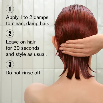 1. Ta 1–2 pump av inpackningen och applicera jämnt i fuktigt hår, med fokus på längder och toppar. 2. Låt verka i 30 sekunder så att de aktiva ingredienserna hinner tränga in och reparera håret. 3. Styla håret som vanligt. Skölj ej ur inpackningen – den ger fortsatt vård och glans under dagen.