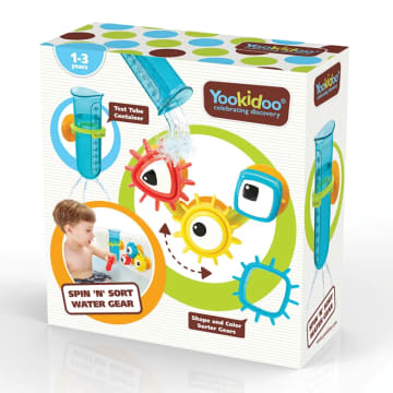 Yookidoo Spin 'N' Sort Water Gear är en rolig badleksak med kugghjul och glas för vattenlekar. Kugghjulen går att sätta fast på badkaret och glaset används för att hälla vatten över kugghjulen så att dom vrider sig. Glaset har små hål i botten så att vattnet rinner ut vilket skapar en rolig vatteneffekt, glaset kan även fästas på badkaret med medföljande hållare.