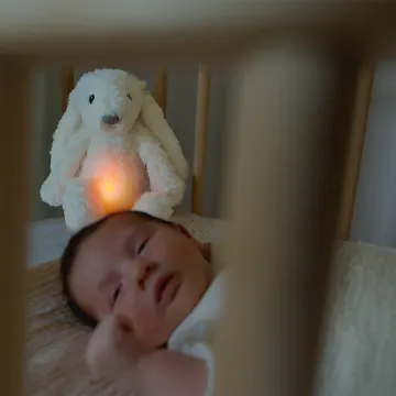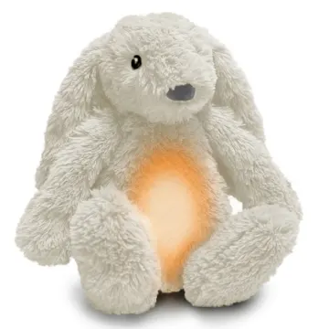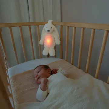 Zazu Ro The Rabbit White är en multifunktionell nattlampa med speldosa. Nattlampan i form av en kanin hjälper till att göra nattningen enklare samtidigt som den skapar en trygg och lugnande sovmiljö för bebisen. Lampan har tre ljusstyrkenivåer och du kan välja mellan flera färger: röd, orange, gul, grön, blå, rosa, pulserande röd eller ett multifärgat läge. Med tio olika ljud och melodier som är rogivande för bebisen: shushing-ljud, hjärtljud, vitt brus, lounge-musik, havets sång, African sunset-sång, andningsljud, tre lugnande vaggvisor. Du kan även välja mellan tre volyminställningar. Du kan välja automatisk avstängning efter 20-40 minuter eller att lampan ska fortsätta lysa och spela ljud hela natten. Den har även gråtsensor med justerbar känslighet. Den smarta gråtsensorn aktiverar Ro automatiskt med de senast använda inställningarna när ditt barn börjar gråta. Återladdningsbara batterier med USB-kabel ingår. Mått: 16 x 10 x 24 cm